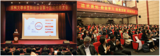 大會還為2018“創青春”全國大學生創業大賽蘇州大學獲獎團隊和指導老師頒獎在完成各項議程的基礎上,本次大會探索“少”而“精”、“簡”而“實”、“知”而“行”的會議模式,得到與會代表的高度評價。參與過三屆學生科協代表大會的余浩同學說:“本次大會給我留下了深刻印象,報告形式簡潔生動,內容切中同學關注點。”