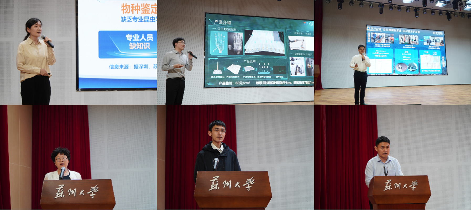 會議以總結視頻《同闖共創向未來》拉開序幕。中國國際大學生創新大賽紅旅賽道創意組國賽金獎項目《昆蟲神探》、高教主賽道本科生創意組銀獎項目《探微觀質》、“挑戰杯”創業計劃賽主體賽國賽銀獎項目《迷流尋蹤》三個項目現場進行路演展示,生動呈現了蘇大學子在科技創新與實踐中的探索成果。蘇州醫學院副院長鐘慧、蘇州醫學院本科生王雪原、軌道交通學院《迷流尋蹤》項目指導老師杜貴府分別作為優秀學院代表、優秀獲獎選手代表、優秀指導老師作經驗分享。