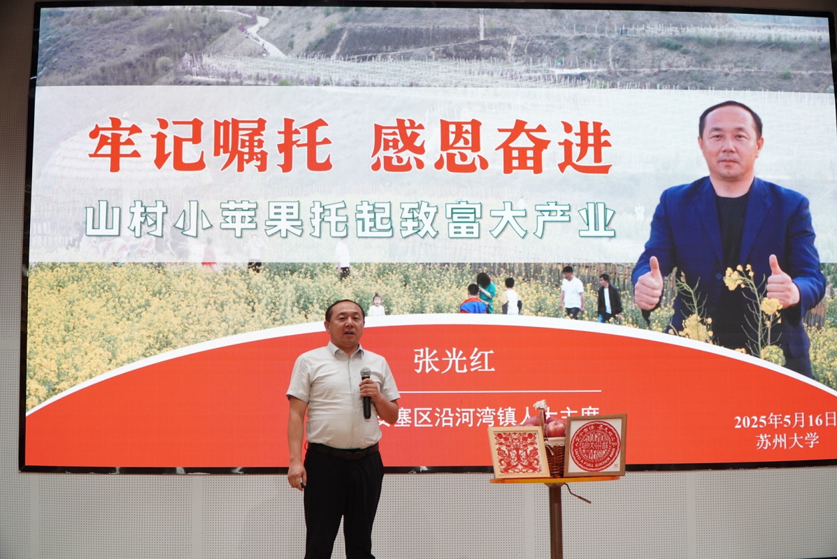 陜西省延安市安塞區沿河灣鎮人大主席張光紅受邀分享《陜北小村莊的蘋果致富路》,講述南溝村農業改革脫貧歷程,并邀請蘇大學子參與“我在延安有棵蘋果樹”助農營銷大賽,為學生搭建起創新實踐與服務社會的橋梁。