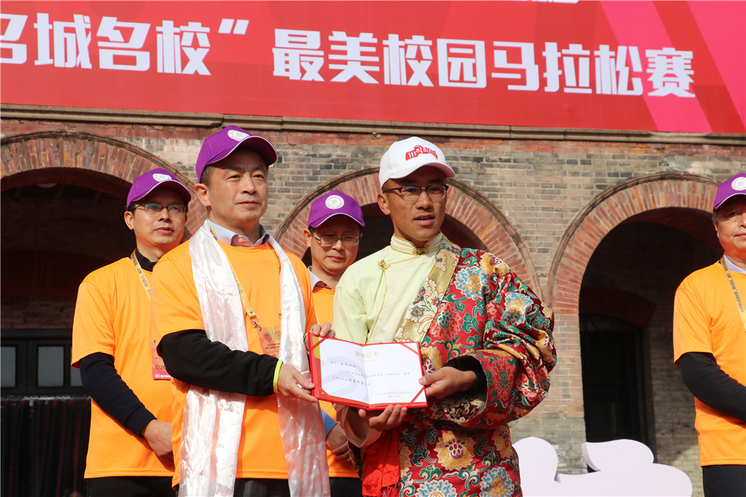 遠(yuǎn)在西藏的我校校友白瑪次仁,去年剛剛從醫(yī)學(xué)部畢業(yè),看到報(bào)名通知后,第一時(shí)間爭(zhēng)取到了參賽名額。大學(xué)四年,我奔跑在每一屆校馬的賽道上。即使畢業(yè)了,我還要回來再跑,與校馬一起成長(zhǎng)。乘坐了6小時(shí)飛機(jī)、30分鐘高鐵、20分鐘地鐵,跨越4200公里,白瑪次仁克服了長(zhǎng)途奔波勞累,在迷你賽中取得了第四名的成績(jī)。馬拉松的意義在于永不言棄和堅(jiān)持到底,更在于享受奔跑過程中帶來的樂趣。不論時(shí)間地點(diǎn)如何變,以后每年的校馬都會(huì)有我的陪伴。” 白瑪次仁當(dāng)選為今年蘇大校馬的“形象跑者”。在起跑儀式上,白瑪次仁向芮國(guó)強(qiáng)敬獻(xiàn)哈達(dá),并領(lǐng)取了榮譽(yù)證書。