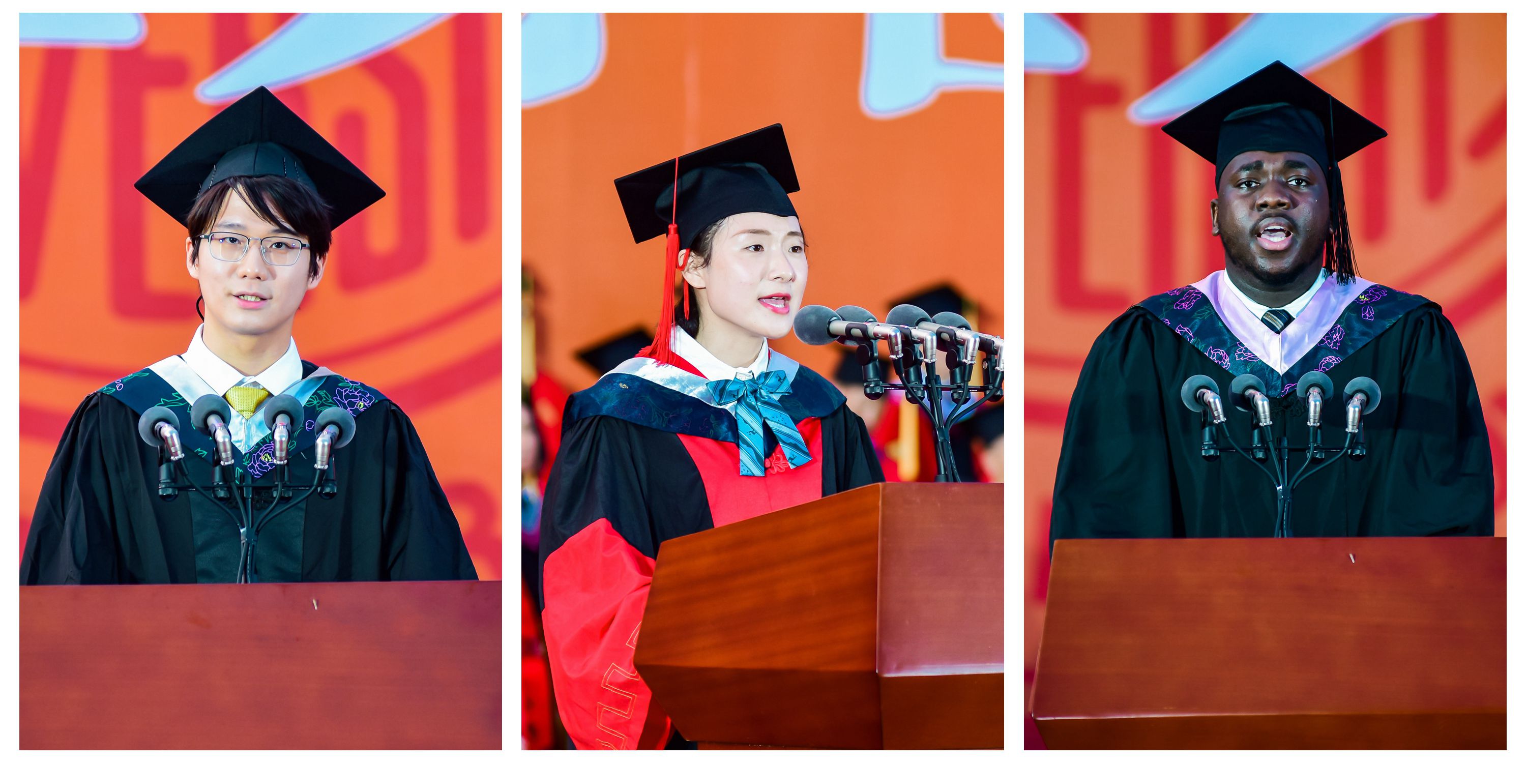 本科生代表、商學院金融學專業熊齊揚分享了四年間自己在蘇大的蛻變成長。即將奔赴中國人民大學直博攻讀經濟學的他,在感謝母校悉心培養的同時,也表示將擔起新時代青年責任使命,牢記母校的囑托,永續蘇大榮光。研究生代表、材料與化學化工學部博士研究生包淑錦向辛勤育人的老師們表示衷心感謝。她說,回望過去,正是蘇大為自己點亮那一盞盞指路明燈,引領自己用拼搏澆灌科研之門、用熱愛投身奉獻之門、用理想開啟未來之門。尼日利亞留學生代表、文學院漢語言文學專業的陳易強,用一口流利的中文回憶了他在蘇大學習生活的點滴。他表示,未來將繼續在文學院漢語國際教育專業攻讀碩士,也希望自己能進一步學習中國文化、體會中國智慧、感受中國力量,為中尼友誼的發展和傳承貢獻自己的積極力量。