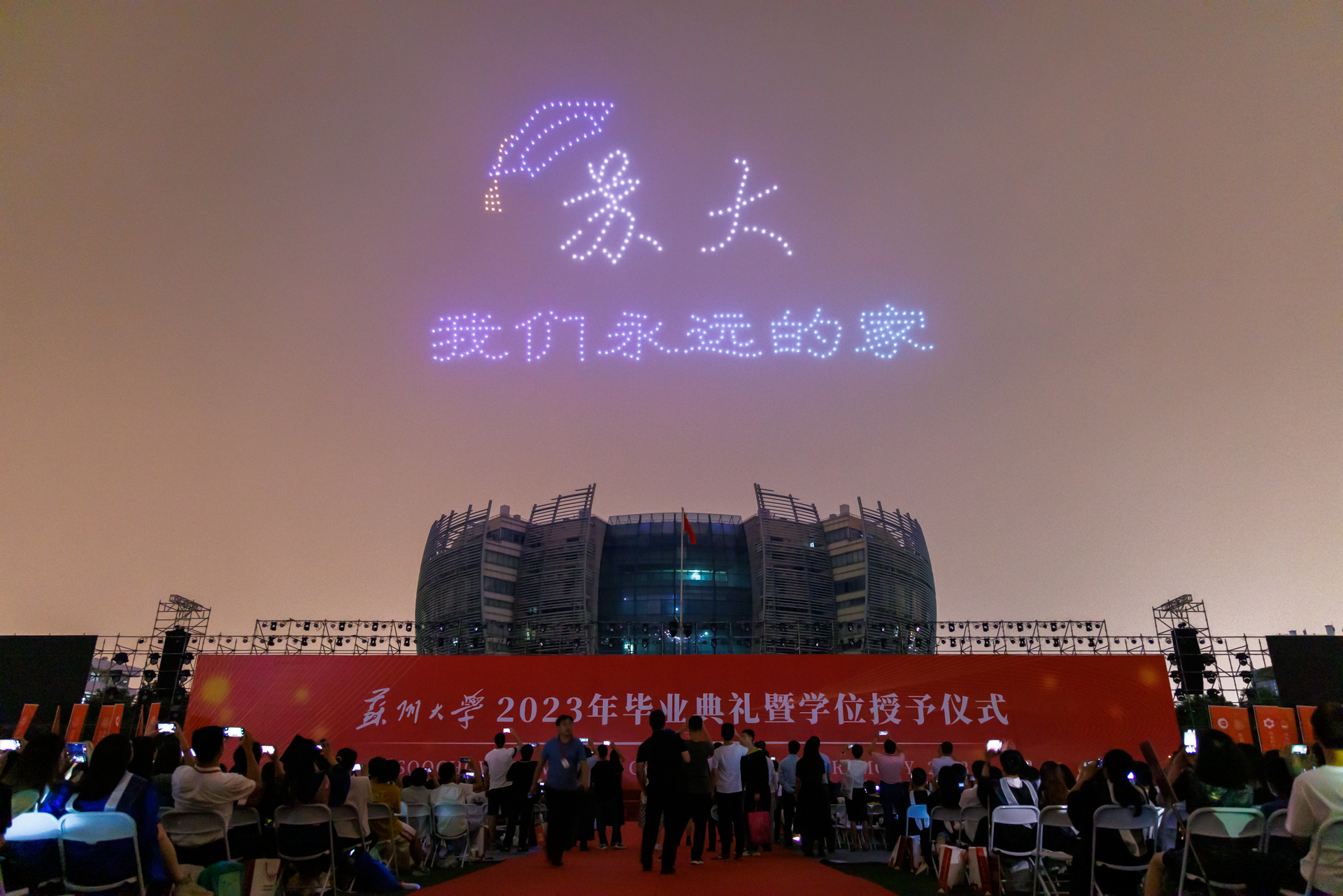 典禮尾聲,一場美輪美奐的無人機表演再次點燃全場。數百架無人機整齊升空,變幻出一幕幕光影畫面。鐘樓、東吳門等蘇州大學標志性建筑以及“養天地正氣 法古今完人”校訓在絢麗燈光下以煙花綻放效果呈現,隨著光影變幻,天空依次出現“請黨放心 強國有我”“成為時代的一束光”“奔赴星辰大海”“蘇大我們永遠的家”“我愛蘇大”等圖案字樣,既飽含母校對遠行學子的深情祝福,更是激勵畢業生牢記黨的教誨母校囑托,志存高遠、腳踏實地,不負韶華、挺膺擔當,以青春之我、奮斗之我建功立業,讓青春在偉大奮斗中綻放光芒!