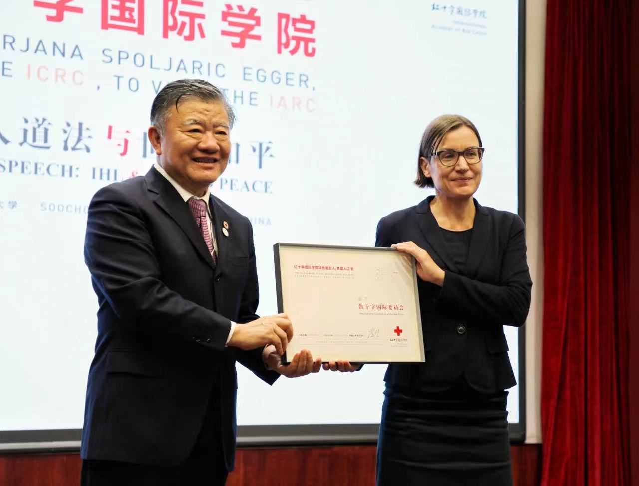 9月7日,紅十字國際委員會(ICRC)主席斯波利亞里茨在中國紅十字會副會長王平的陪同下,訪問我校紅十字國際學院,并發表題為“國際人道法與世界和平”的主題演講。中國紅十字會會長、紅十字國際學院名譽院長陳竺出席活動,并向紅十字國際委員會頒發“紅十字國際學院聯合共建人”榮譽證書。