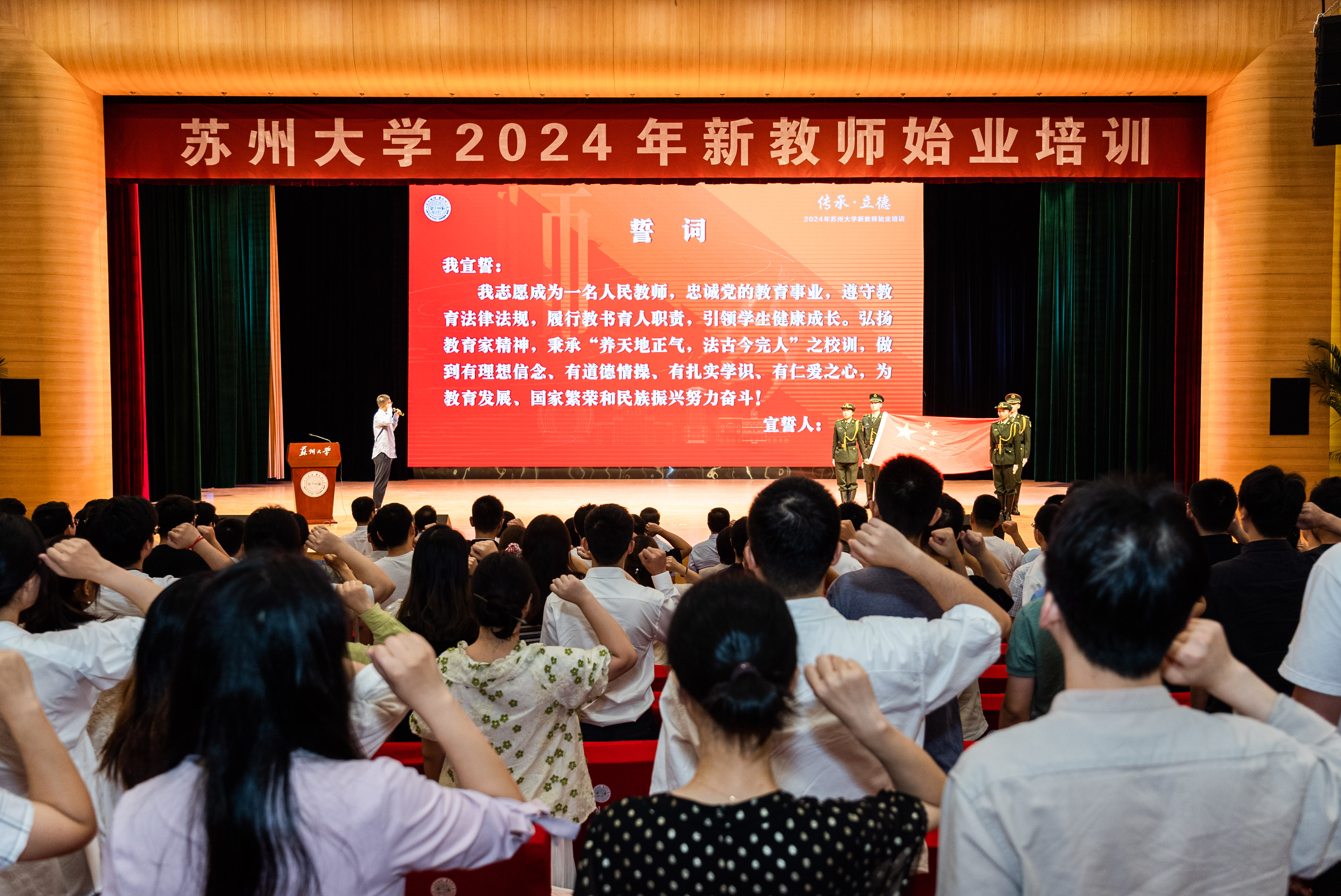 獲得2024年度蘇州大學“立德樹人獎”的教師們通過短視頻傳遞了對新教師的期待與囑托。學校有關職能部門負責人向新教師代表贈予《蘇州大學校史》并頒發校徽,象征著“養天地正氣,法古今完人”校訓精神的傳承和發揚。全體新教師高舉右拳,面向國旗作出莊嚴宣誓,傳遞出奉獻教育的堅定決心。