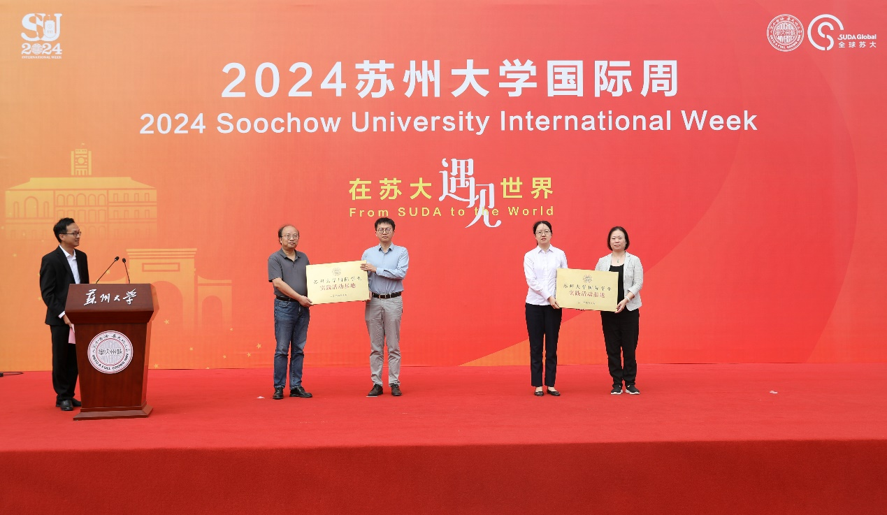 為增強國際學生對中國國情的認知,促進文化交流和理解,我校與吳文化博物館、市規劃展示館合作建立“蘇州大學國際學生社會實踐基地”。開幕式上,我校海外教育學院院長夏駿國際合作交流處副處長朱履驊為兩大基地授牌。